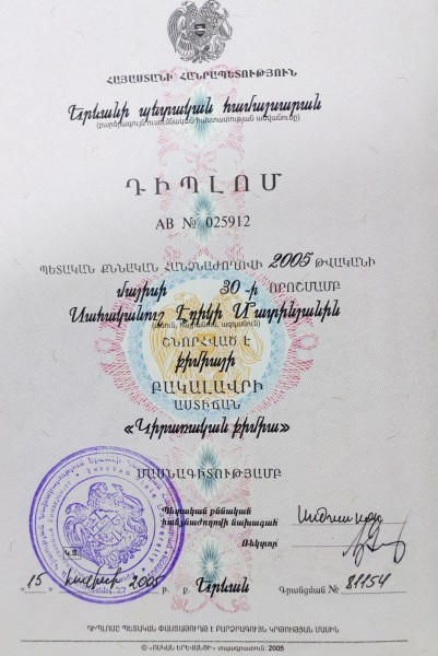 Ավարտել եմ ԵՊՀ քիմիայի ֆակուլտետի «Կիրառական քիմիա» բաժինը' գերազանց առաջադիմությամբ։ Գերազանց տիրապետում եմ ռուսերեն լեզվին։