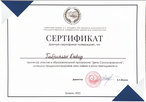 Готовлю учеников 5−9 классов к экзаменам по математике и физике, помогаю повысить успеваемость. 🎓 Образование • Окончил обучение по программе проекта «Математическая вертикаль». • Учусь на втором курсе по направлению «Квантовая информатика». 📚 Опыт • Имею опыт преподавания с 2022 года. • Знание школьной и олимпиадной программы. • Владение онлайн-инструментами (доски, планшет, презентации). 📊 Личные качества • Терпеливый, объясняю материал с нуля. • Структурированный подход: теория → примеры → практика. • Интерес к науке, технологиям и современному образованию. 🌍 Дополнительно • Языки: Русский, Английский B2, Армянский Провожу занятия онлайн, а также могу выезжать к ученику домой. Ես 5-9-րդ դասարանների աշակերտներին պատրաստում եմ մաթեմատիկայի և ֆիզիկայի քննություններին և օգնում եմ բարելավել նրանց ակադեմիական առաջադիմությունը։ 🎓 Կրթություն • Ավարտել եմ «Մաթեմատիկական ուղղահայաց» նախագծային ծրագրի շրջանակներում ուսուցումը։ • Ես երկրորդ կուրսի ուսանող եմ «Քվանտային ինֆորմատիկա» ծրագրով։ 📚 Աշխատանքային փորձ • Ունեմ դասավանդման փորձ 2022 թվականից։ • Դպրոցի և օլիմպիադայի ծրագրի իմացություն։ • Օնլայն գործիքների (տախտակներ, պլանշետ, շնորհանդեսներ) տիրապետում։ 📊 Անձնական որակներ • Համբերատար, բացատրում եմ նյութը զրոյից։ • Կառուցվածքային մոտեցում. տեսություն → օրինակներ → պրակտիկա։ • Հետաքրքրություն գիտության, տեխնոլոգիաների և ժամանակակից կրթության նկատմամբ։ 🌍 Լրացուցիչ • Լեզուներ՝ ռուսերեն, անգլերեն B2, հայերեն Ես դասընթացներն անցկացնում եմ առցանց և կարող եմ նաև գնալ աշակերտի տուն։
